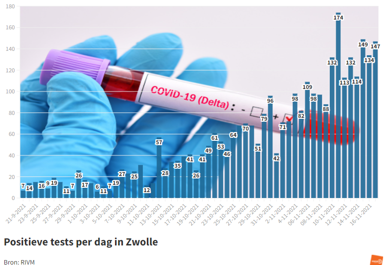 Zwolle – In Zwolle werden op woensdag 17 november 147 positieve testen (dinsdag 134) gemeld. Voor de hele Veiligheidsregio gaat het om 625 (dinsdag 488) positieve testen. Dat blijkt uit de laatste cijfers van het RIVM, die vandaag zijn gepubliceerd.