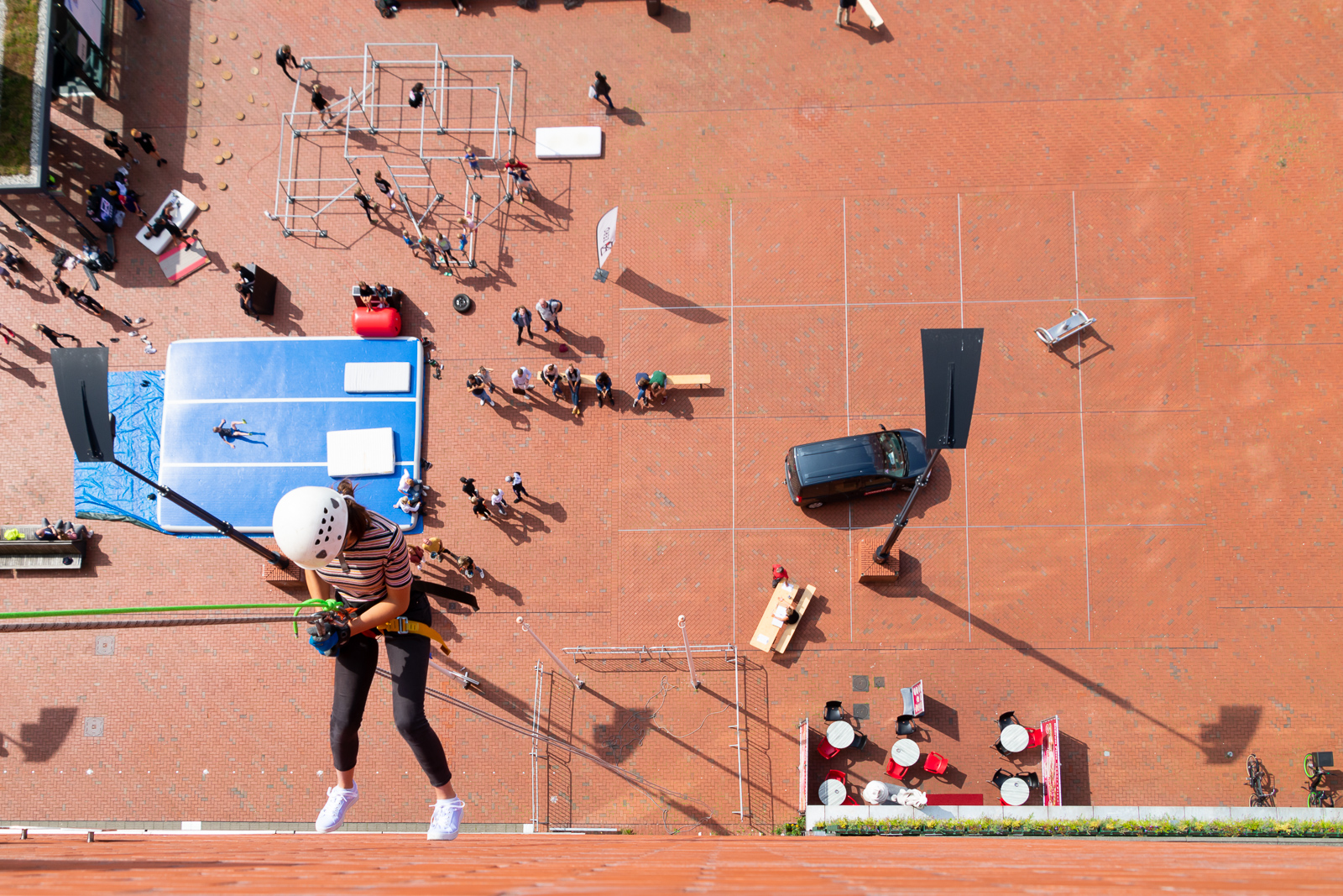 Zwolle – Abseilen vanaf het Stadskantoor in Zwolle! Het was één van de activiteiten tijdens het driedaagse LübeckPleinFestijn om meer reuring te krijgen op het plein in het Hanzeland. En dat lukte. Tussen de dertig en de veertig mensen stortten zich van de 35 meter hoge gevel naar onderen.