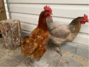2 kippen: 1 bruine en 1 grijs met bruine kip. Gevonden op 10-11-2021. Zuiderkerkstraat.