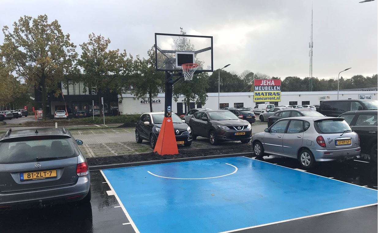 Basketbalveld ingeklemd tussen de auto’s op parkeerterrein WRZV-hallen