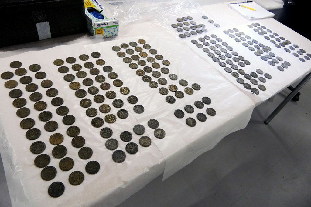 Collectie Overijssel bezit in totaal 231 van dit soort brandspuitpenningen, allen met een diameter van vier centimeter. Er zijn exemplaren van tin en van messing, sommigen behoorlijk beschadigd terwijl anderen nog in prima staat zijn. Dankzij de twee heren van het KNGMP zijn nu alle brandspuitpenningen gemeten, gewogen en van liefdevol commentaar voorzien. Zo weten we nu dat er van iedere wijk een fiks aantal penningen in de collectie zit.