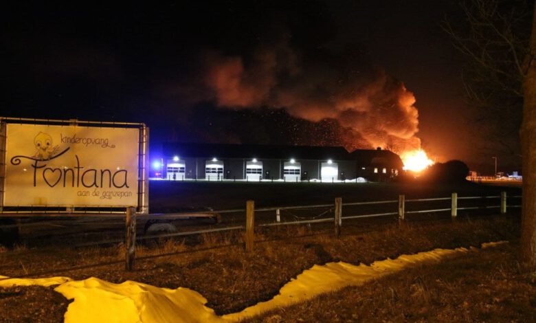 De loods moet als verloren worden beschouwd. De brandweer heeft overslag naar andere gebouwen weten te voorkomen.
