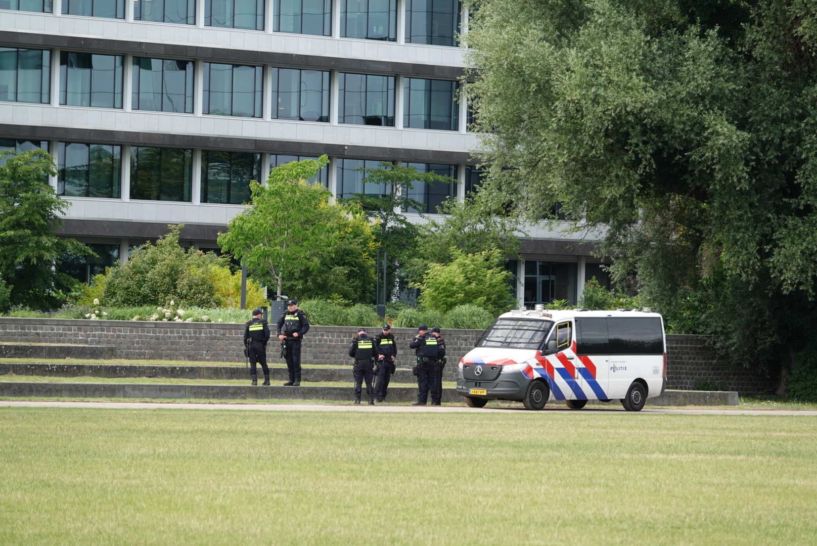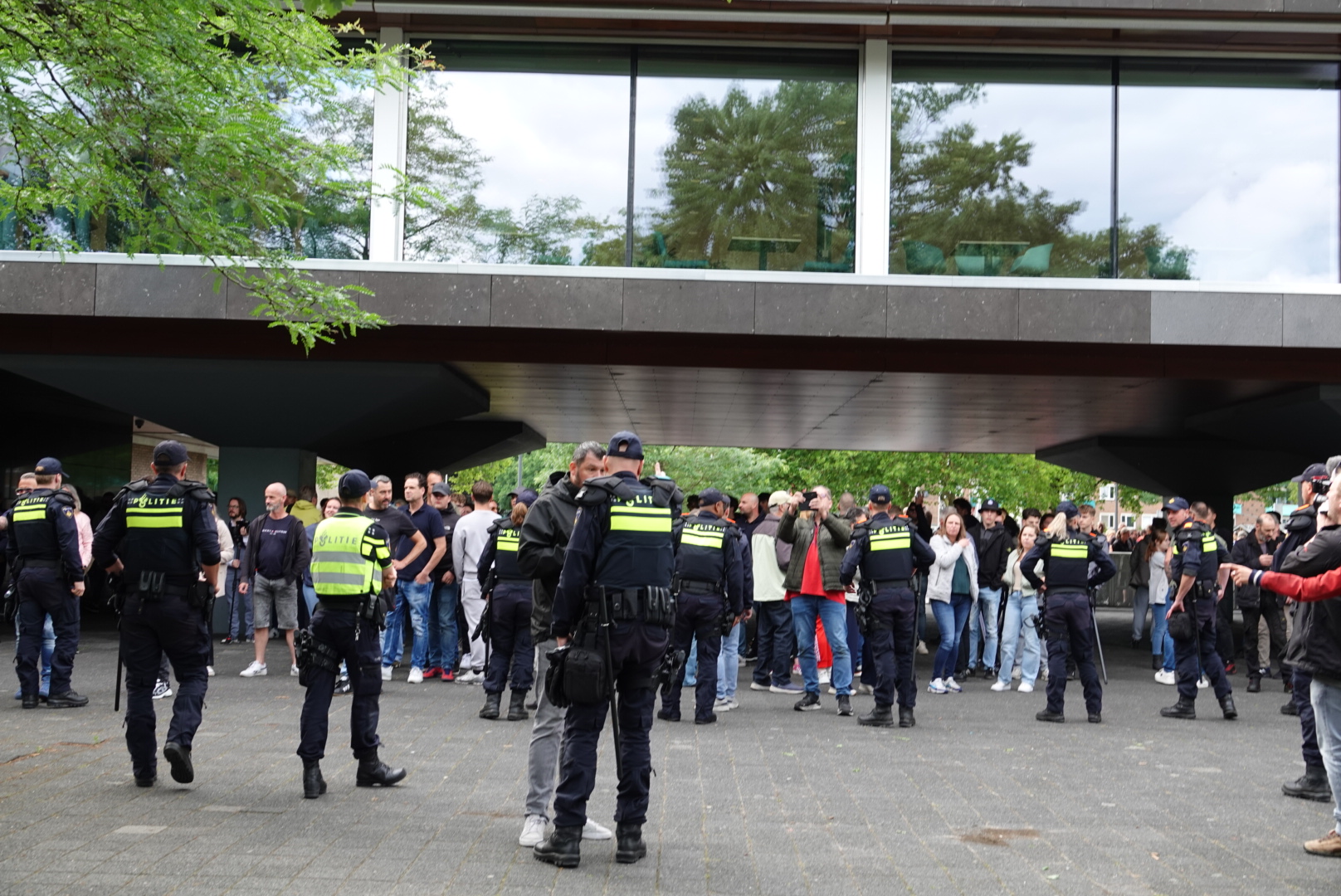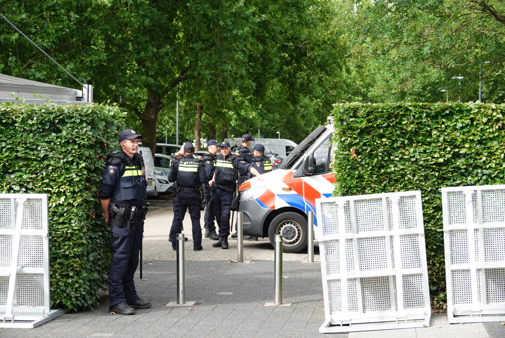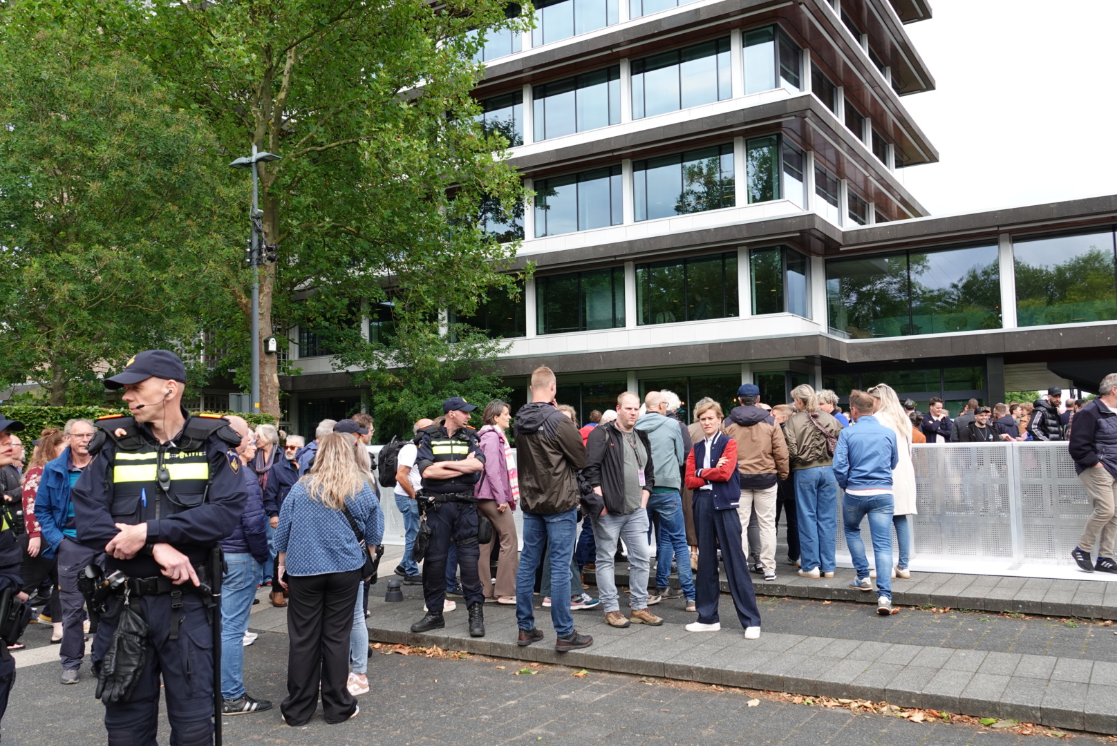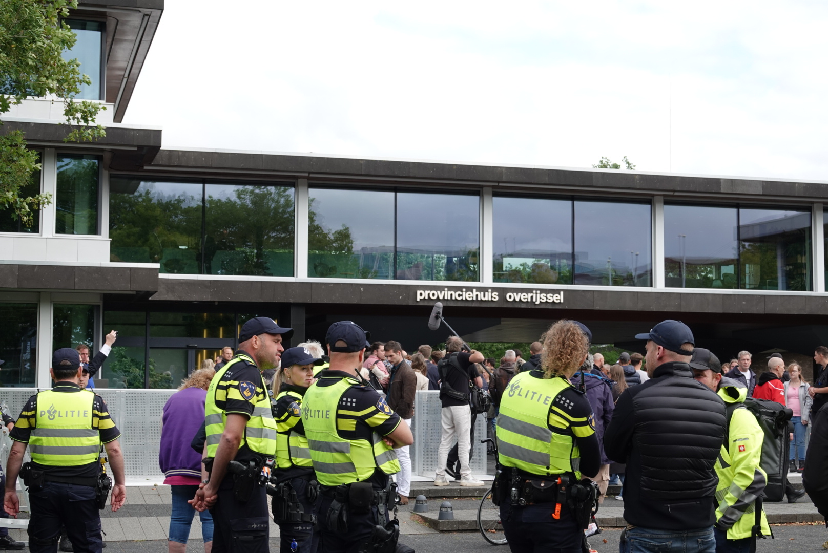 Ook achter het Provinciehuis staat veel politie opgesteld. De sfeer is vooralsnog kalm, al worden hier en daar mensen kort staande gehouden voor een gesprekje of controle.