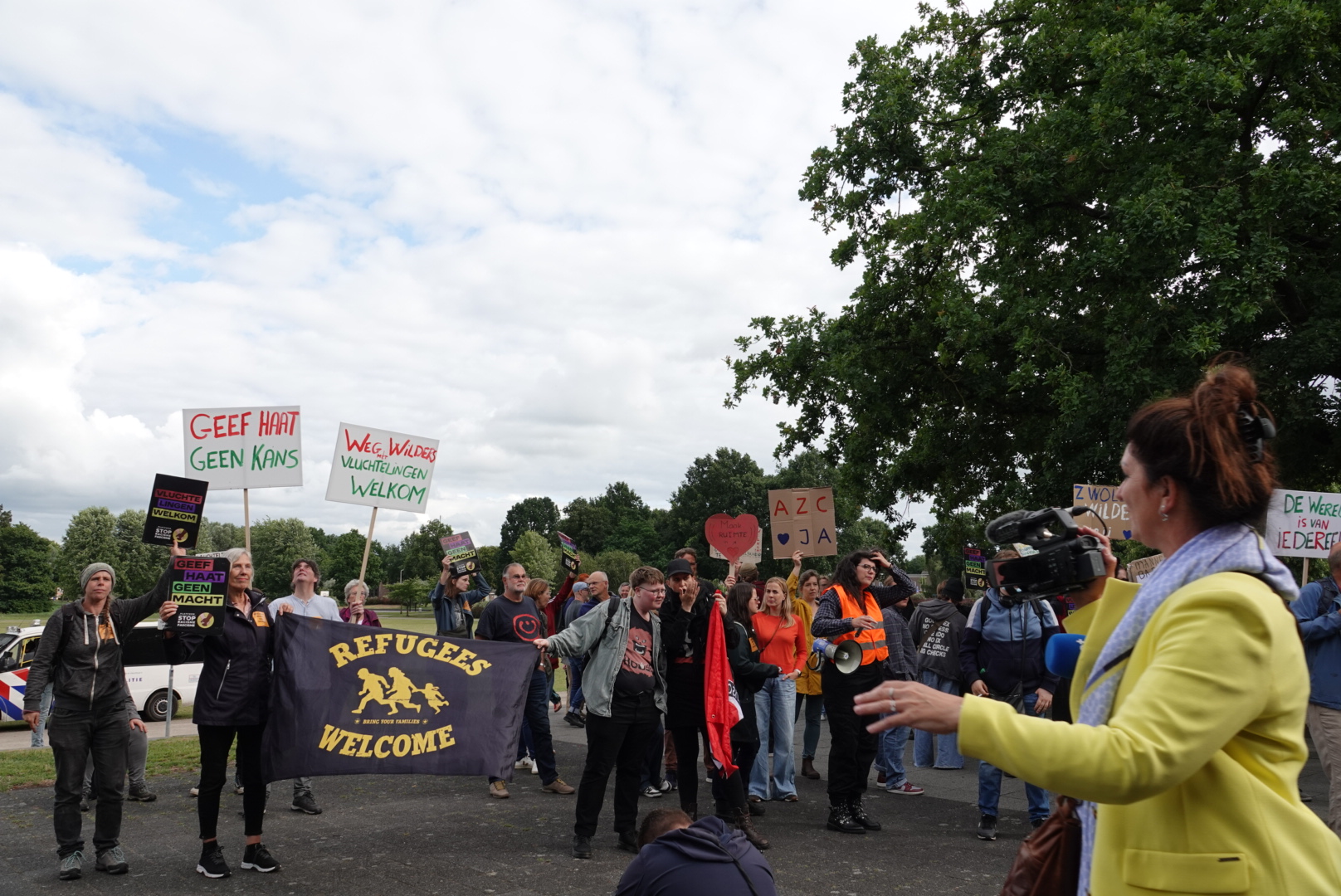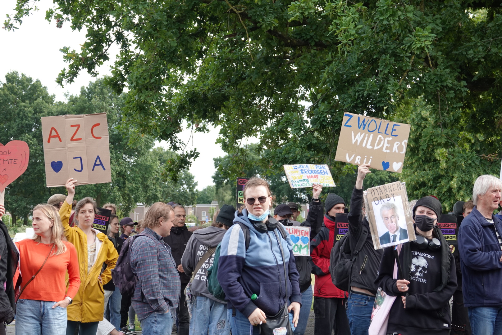 Rond tien over zes komt een grote groep voorstanders in colonne aanlopen richting het Provinciehuis. Veel ogen zijn nu gericht op de komst van PVV-leider Geert Wilders, die zich in het debat fel heeft uitgesproken tegen nieuwe AZC’s.