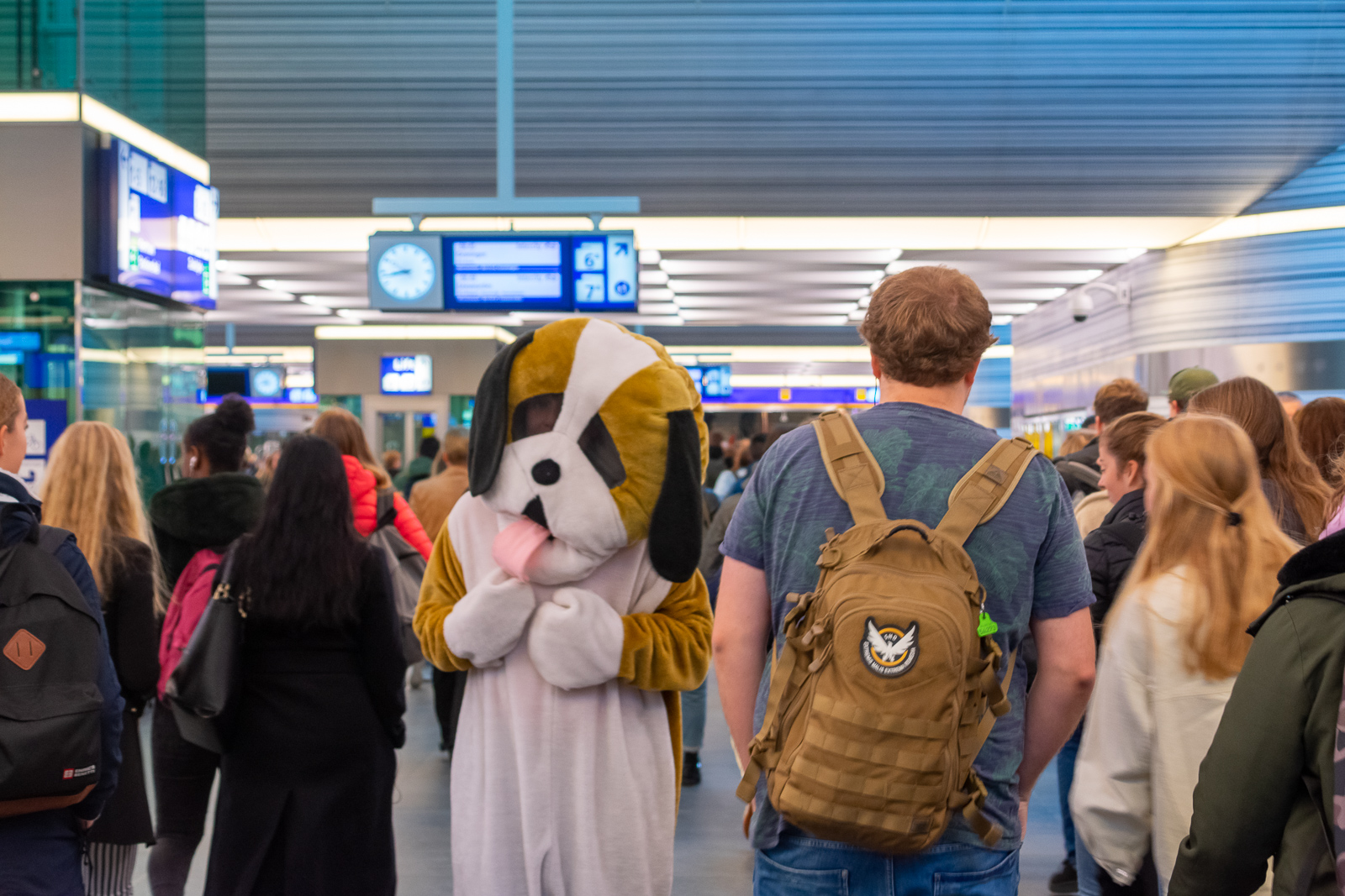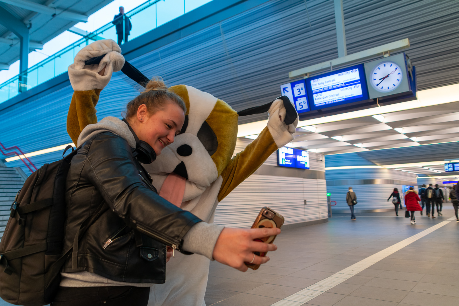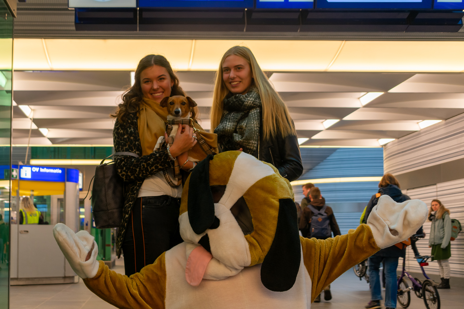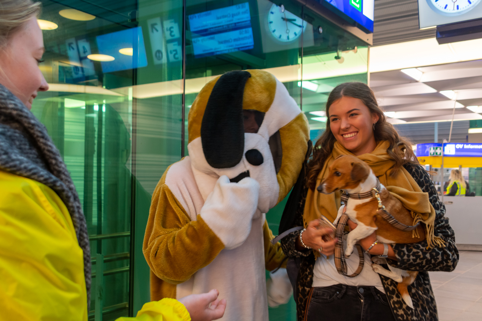 Zwolle – Reizigers op station Zwolle werden donderdag onthaald met een knuffel tijdens de drukke ochtendspits. Een NS medewerkster in hondenpak knuffelde de gehaaste reizigers en ging met ze op de foto.