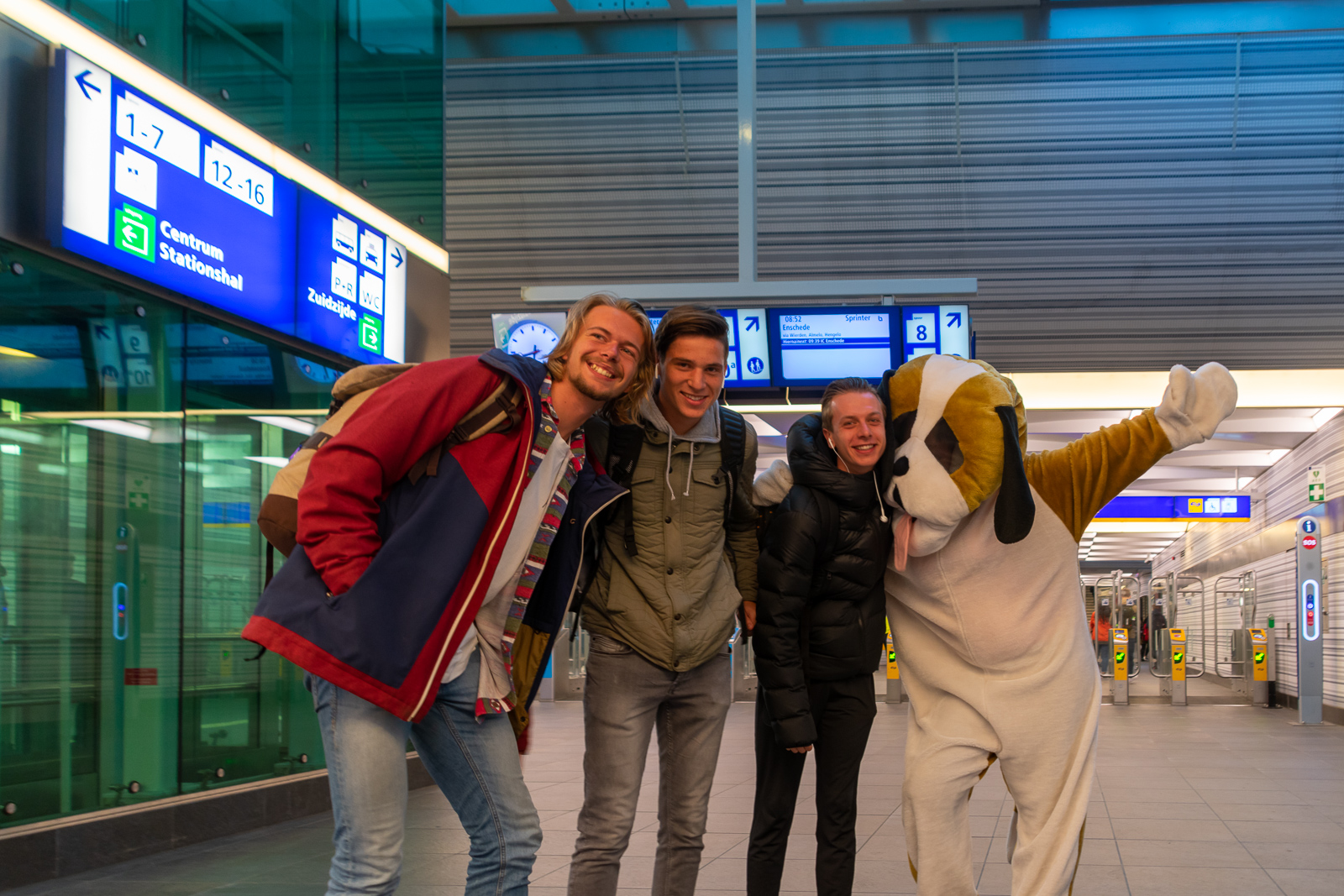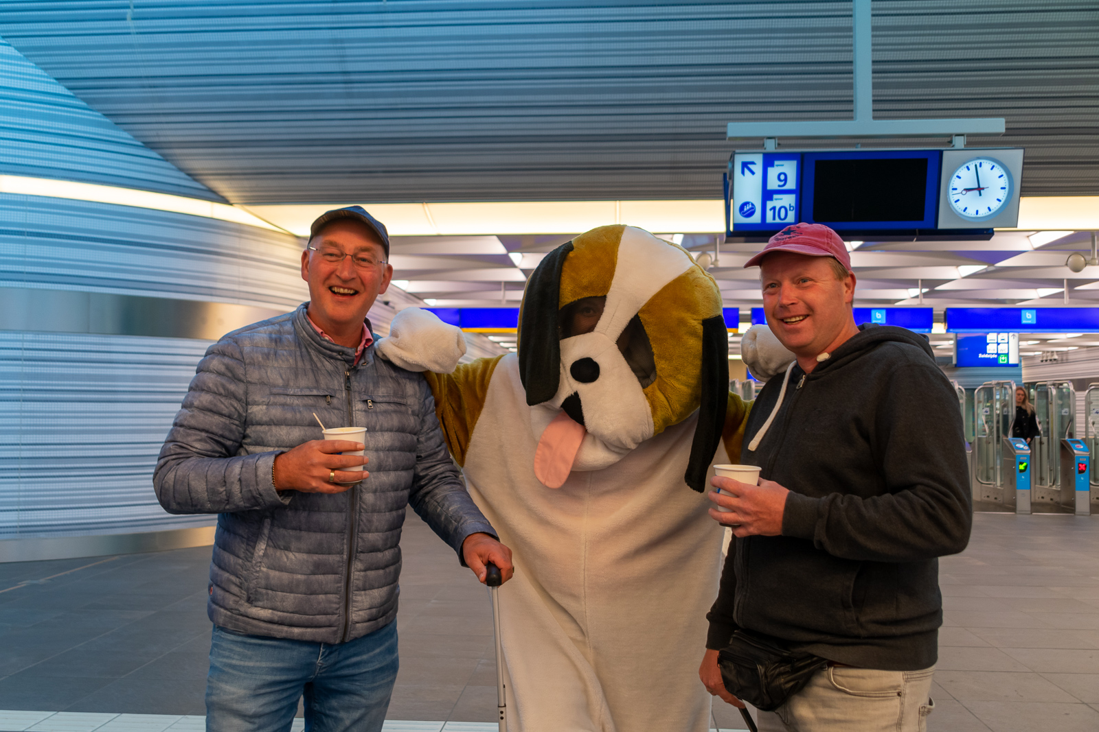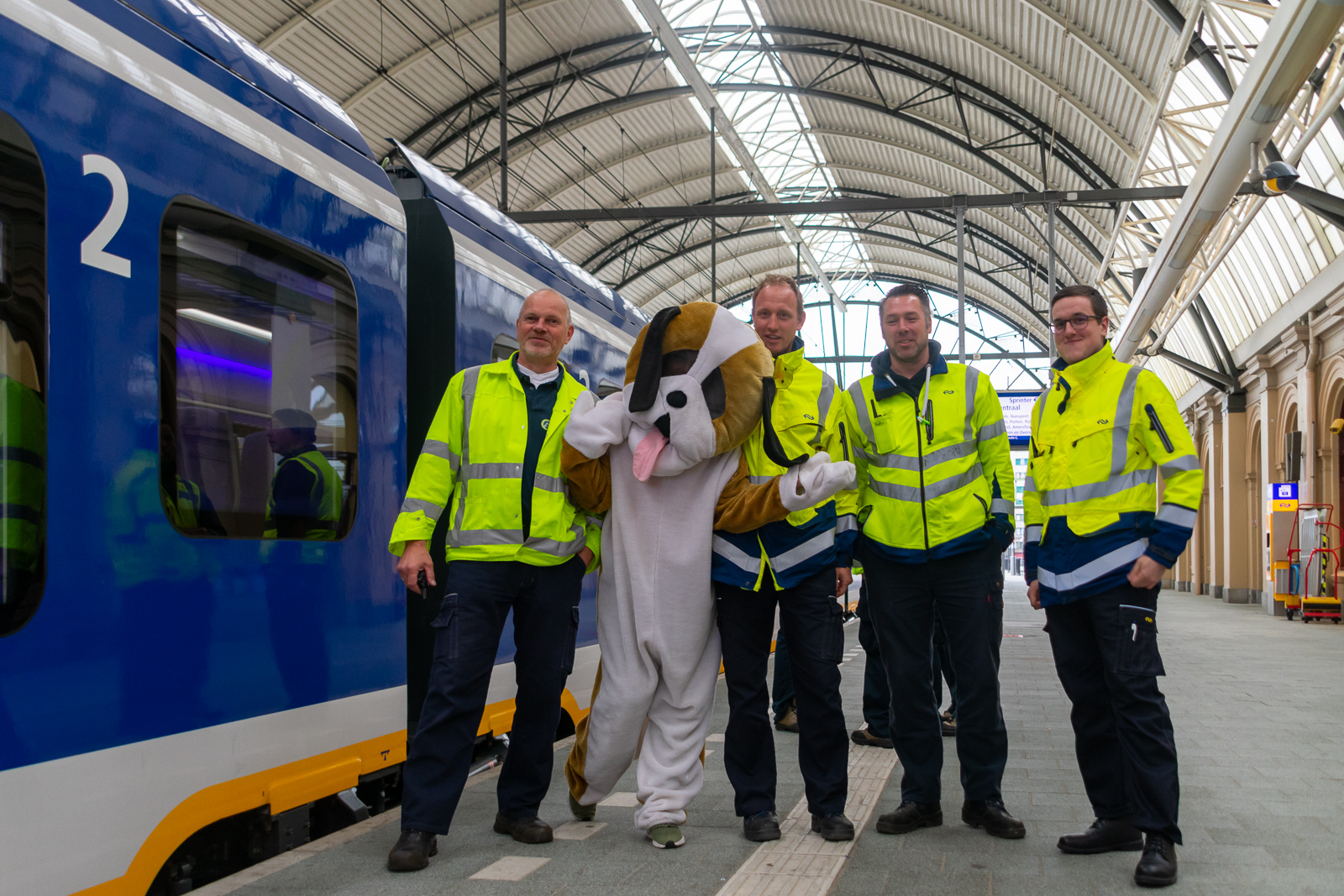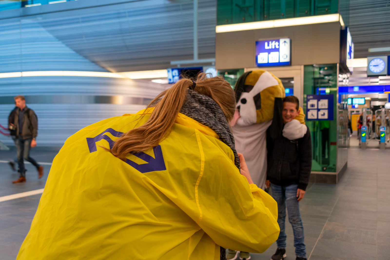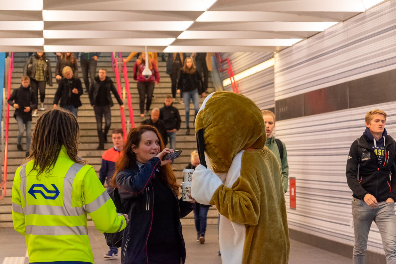 Zwolle – Reizigers op station Zwolle werden donderdag onthaald met een knuffel tijdens de drukke ochtendspits. Een NS medewerkster in hondenpak knuffelde de gehaaste reizigers en ging met ze op de foto.