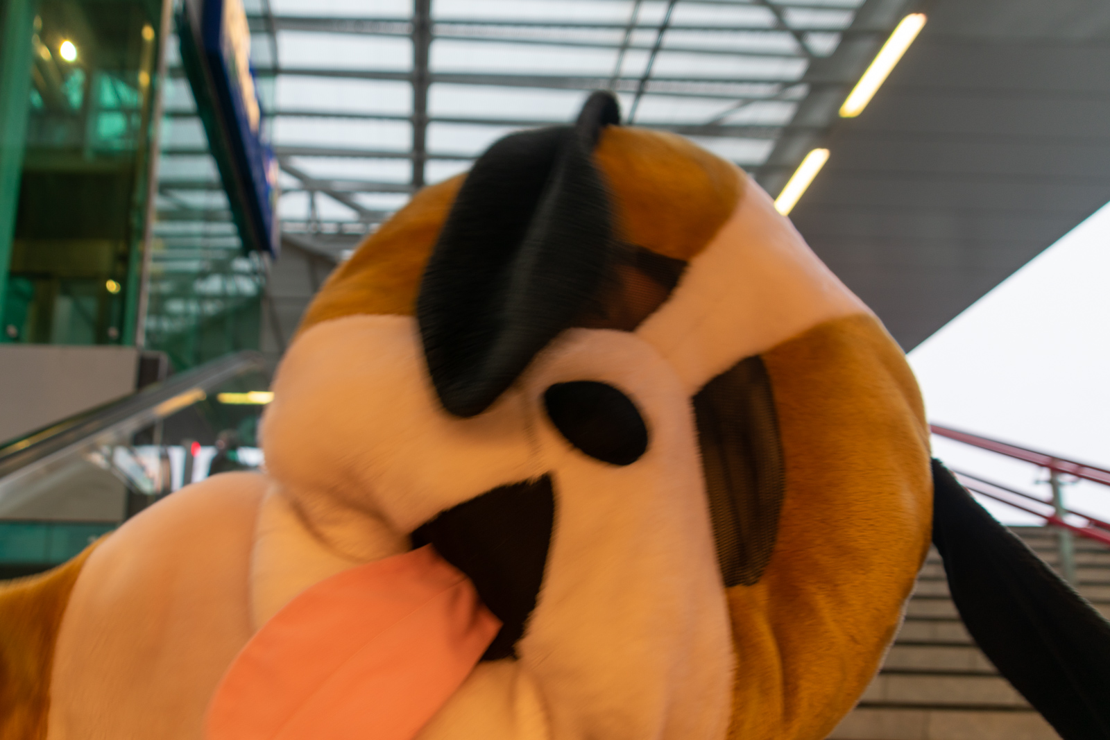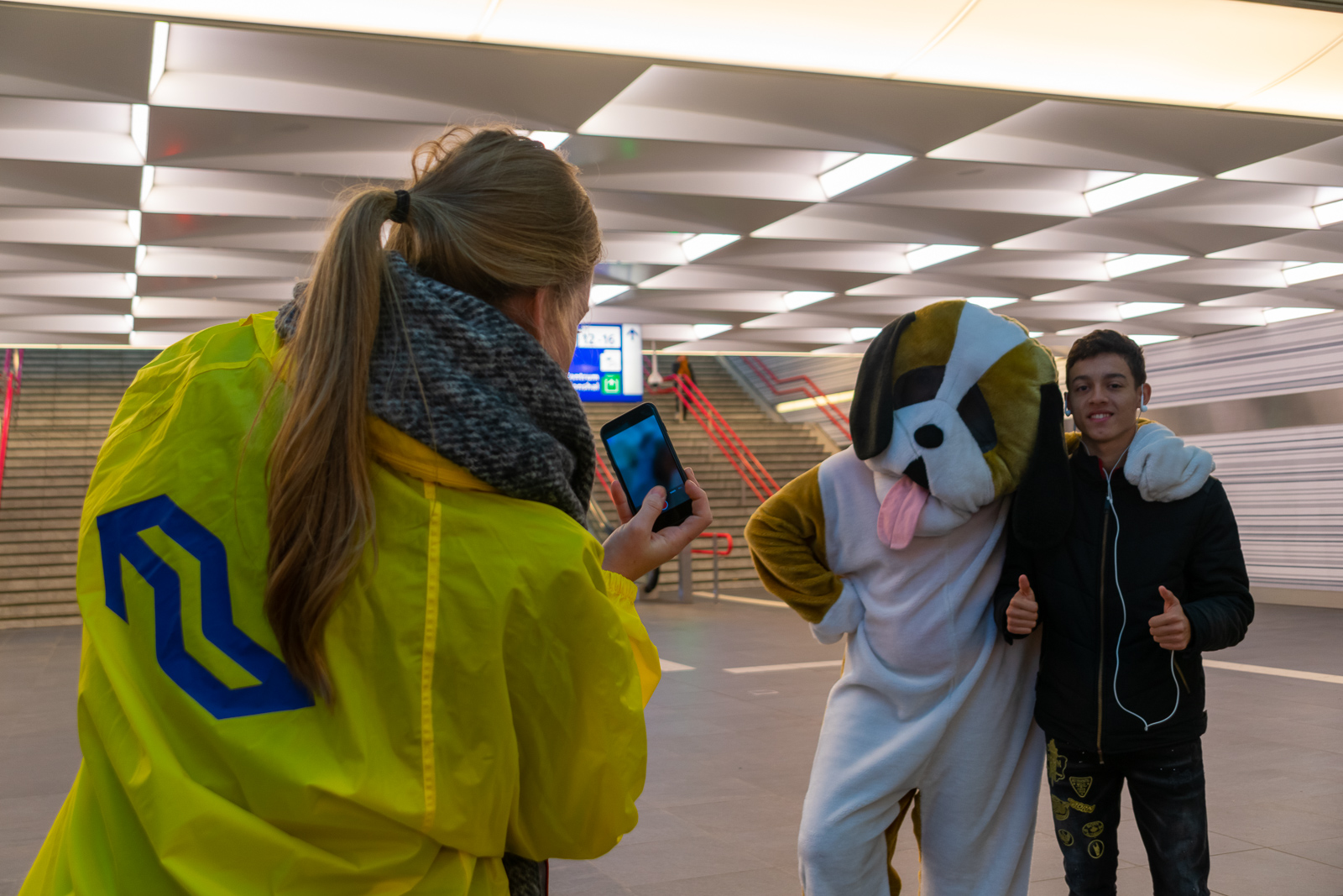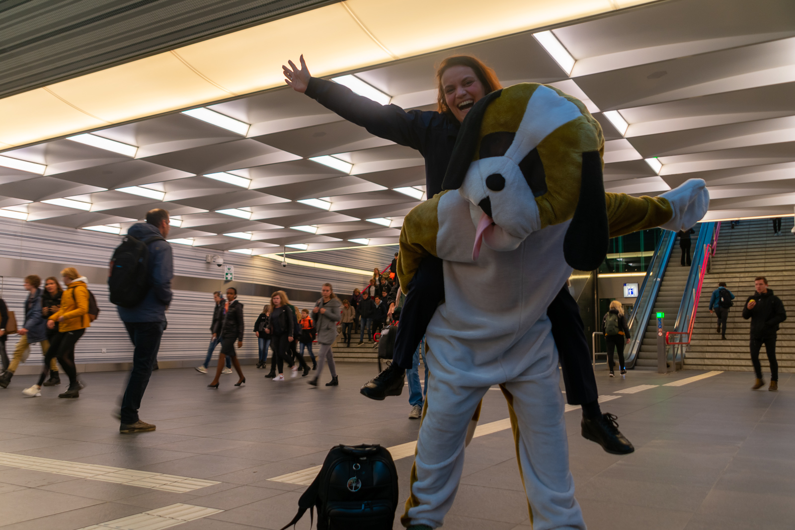 Conductrice Melanie had het plan opgevat om op dierendag de reizigers te begroeten terwijl ze verkleed was als hond. Een vriendin van haar, Alexandra, zou dan foto’s maken met haar camera. Toen ze haar plan ontvouwde bij haar werkgever waren de reacties positief. Het duo moest hierdoor voor dag en dauw opstaan op dierendag. Om zeven uur ’s ochtends stonden ze paraat op het perron om een glimlach op het gezicht van de vroege reizigers te toveren. Ook werd er heel wat afgeknuffeld in de reizigerstunnel onder het station. Alexandra maakte voor wie het wilde een foto of een selfie voor social media.
