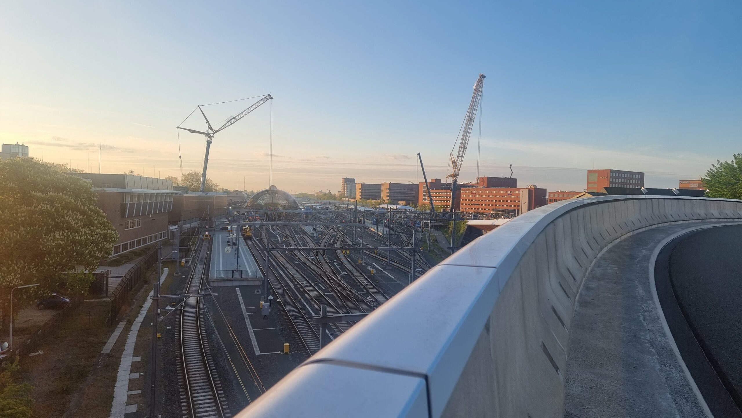 De busbrug geeft je rond 12 uur een prachtig zicht op het inhijsen van de eerste brugligger. Ook aan de zuidkant van het station, achter het P&R-terrein, kun je de hele klus bekijken.