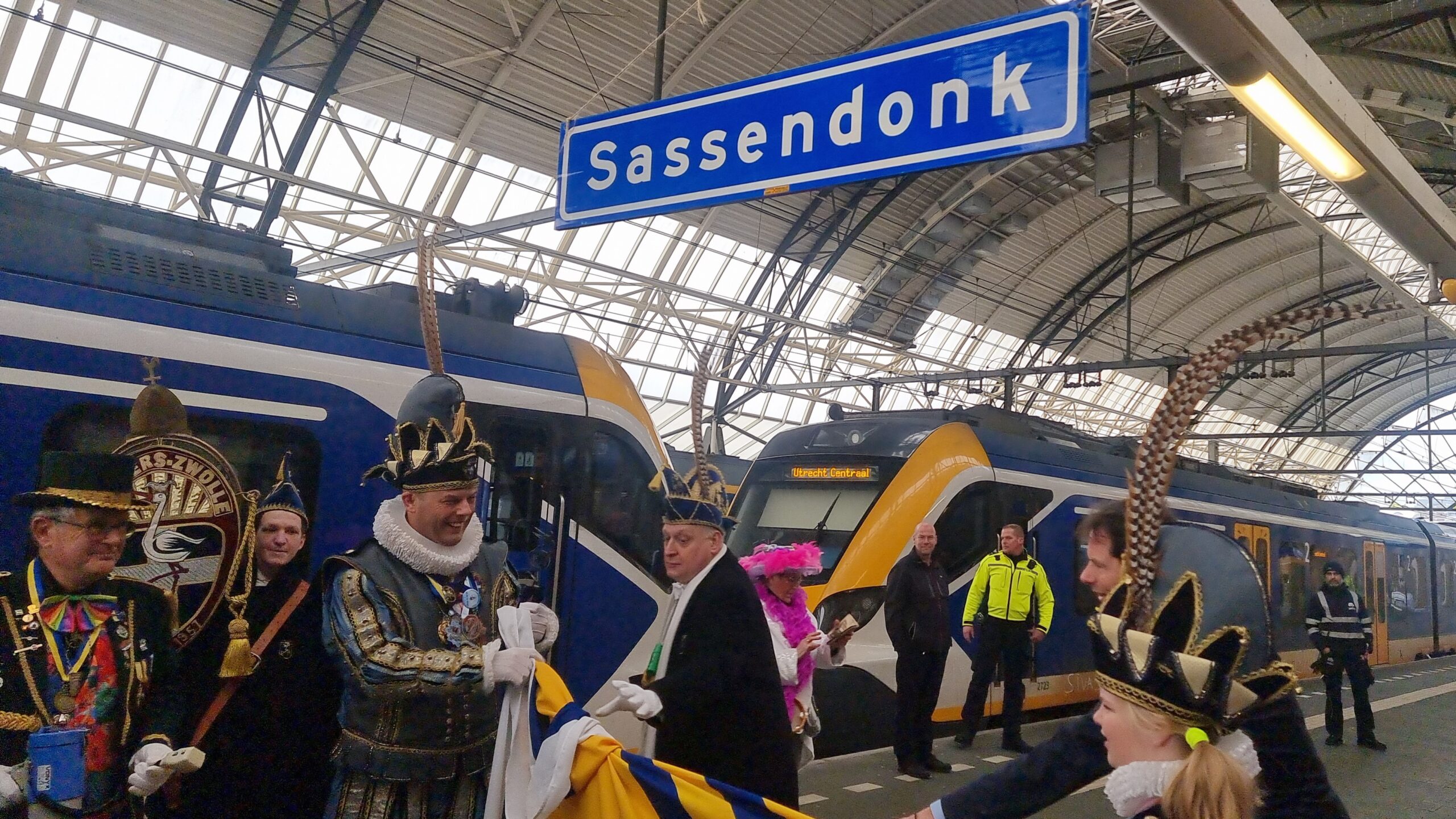Zwolle – Het was weer als vanouds! Zaterdag ochtend kwam Prins Michaël, Jeugdprinses Vlinder en hun adjudanten aan op Station Zwolle rond de klok van tien. Een compleet kleurrijk uitgedost ontvangstcomité stond al klaar op het perron om de hoogheden te verwelkomen. Na aankomst werd het stations bord Sassendonk onthuld. Zwolle is dus weer Sassendonk!