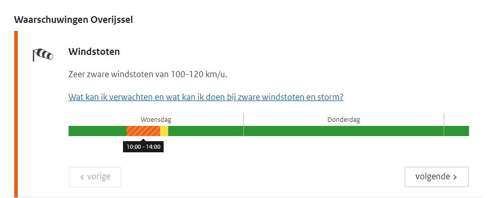 Elders komen er vanochtend en vanmiddag zware windstoten voor van 75-100 km/u.
