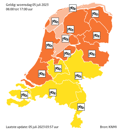 In Zuid-Holland, Overijssel, Drenthe, Groningen en het Waddengebied staat een code oranje uit. In de eerste helft van de middag neemt de wind weer af. De wind waait uit het westen.