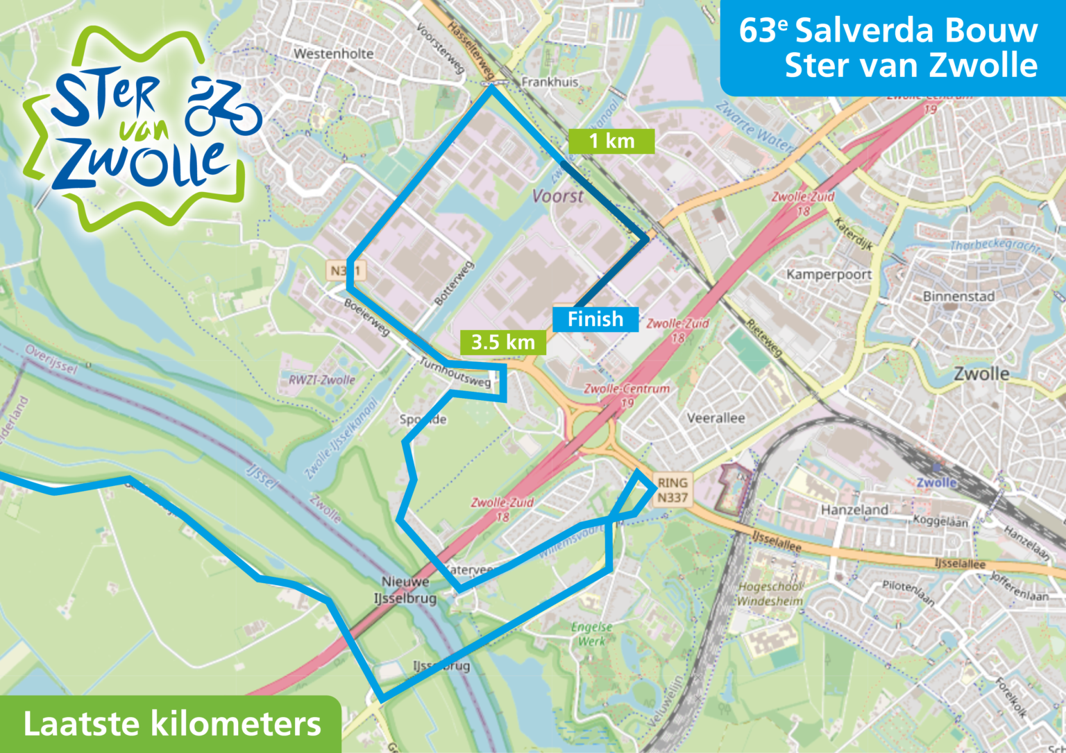 De wielerploeg komt via de Spoolderbergweg – Kleine Veerweg – Nilantsweg – Meenteweg – Turnhoutsweg – Westenholterallee – Hasselterweg – Voorsterbrug – Hasselterweg – Blaloweg naar de finish ter hoogte van Scania. Hiervoor is de Blaloweg in de richting van de A28 afgesloten. Het gaat om het gedeelte tussen Hasselterweg/Russenweg en de Westenholterallee. De Blaloweg in de richting van de Zwartewaterallee blijft open. Doorgaand verkeer wordt omgeleid via de Hasselterweg en de Westenholterallee richting de A28. Het fietspad is ook afgesloten. Fietsers worden omgeleid naar het fietspad aan de overkant.