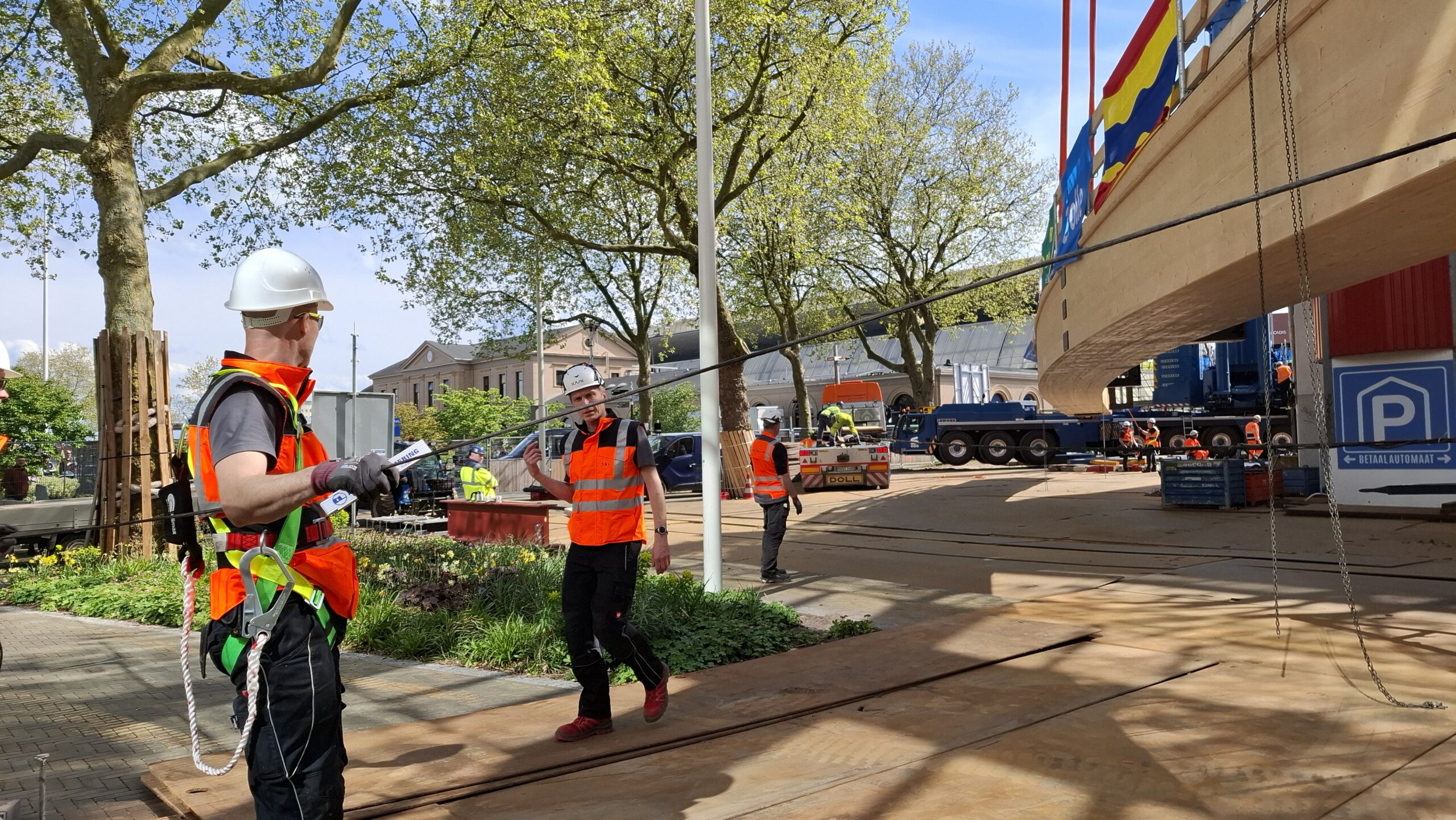 Even verderop troffen we een toeschouwer aan, zittend op een bierkratje, met een verrekijker in de hand: “Een dagje uit,” merkte hij op “Je maakt dit maar één keer mee. Eigenlijk een goed excuus om een pilsje te drinken overdag.” Dat deed hij niet alleen, maar zijn vrienden waren even naar de kringloop om campingstoelen op te halen en wat borrelnootjes bij de super. “We doen een technische studie, dus dit past ook wel goed. Stiekem vinden we dat natuurlijk ook mooi, die grote hijskranen en zo”.