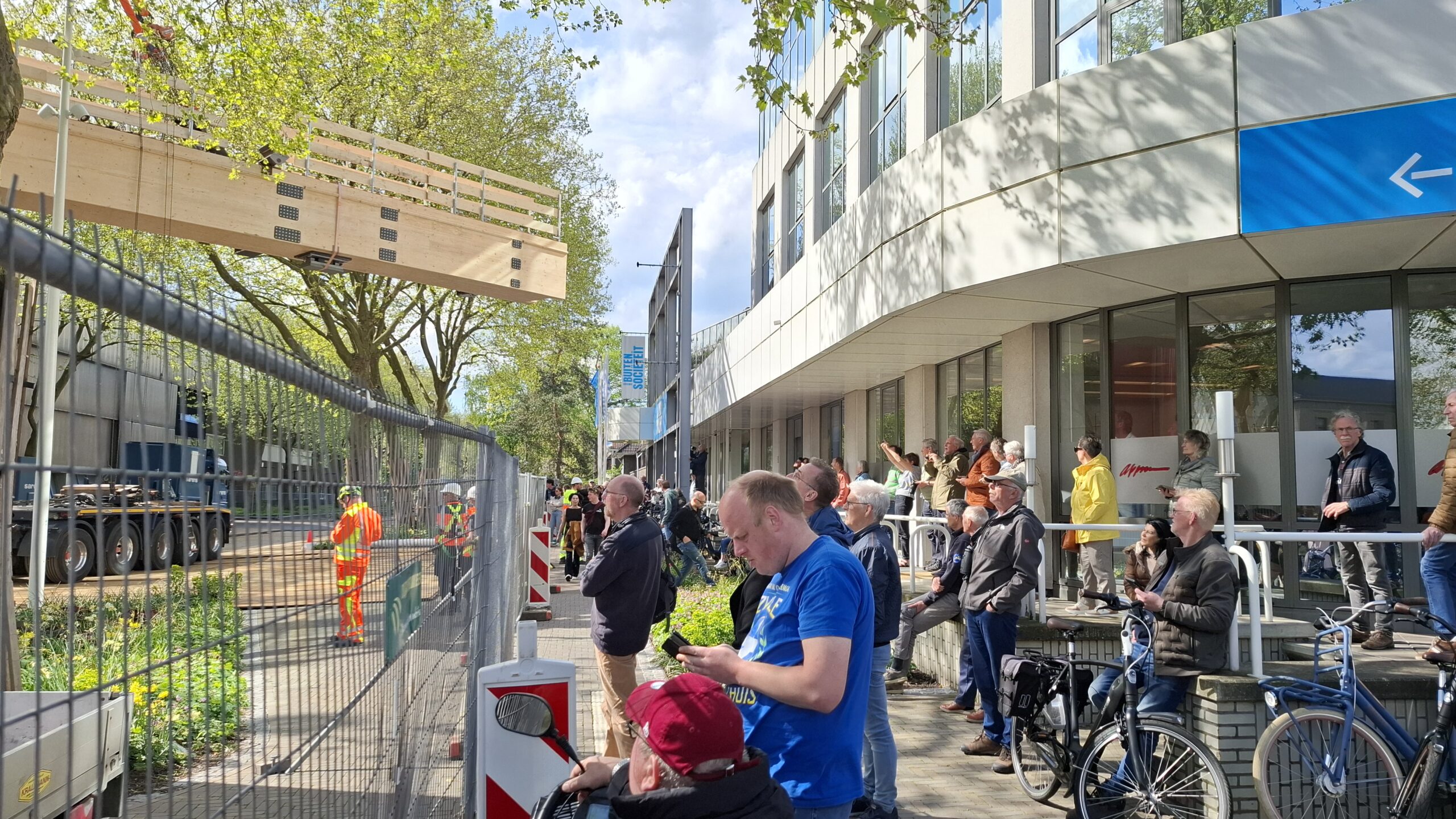 Het spektakel trok al vroeg op de dag nieuwsgierige toeschouwers, die genoten van het schouwspel op de voor de gelegenheid toegankelijk gemaakte busbrug. Een van de kijkers was met zijn scootmobiel de steile busbrug opgereden. “Ik was hier vanmorgen al eerder, maar toen was het nog niet bezig. Dus ik dacht, even een broodje eten thuis, en daarna ben ik hier weer naartoe gegaan.” vertelt de meneer duidelijk genietend van de zonnige dag en het mooie uitzicht.
