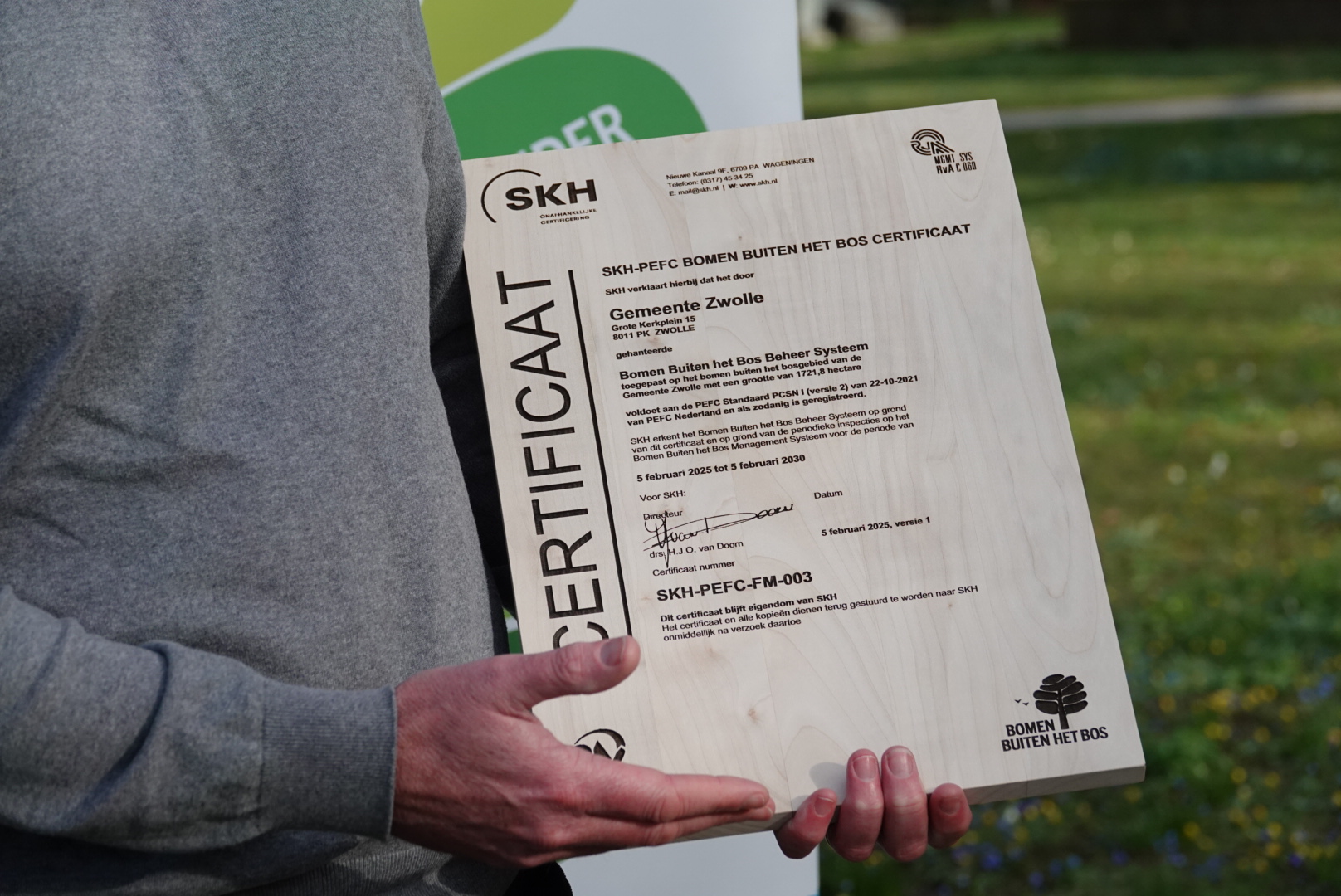 De uitreiking vond plaats in Park Eekhout, waar wethouder Duurzame Stadsontwikkeling Arjan Spaans het certificaat in ontvangst nam van Oscar van Doorn, directeur van certificeringsinstantie SKH. Met deze erkenning zet Zwolle een belangrijke stap in duurzaam bomenbeheer, waarbij gekapte stadsbomen een tweede leven krijgen in bijvoorbeeld bouwprojecten of als meubilair.