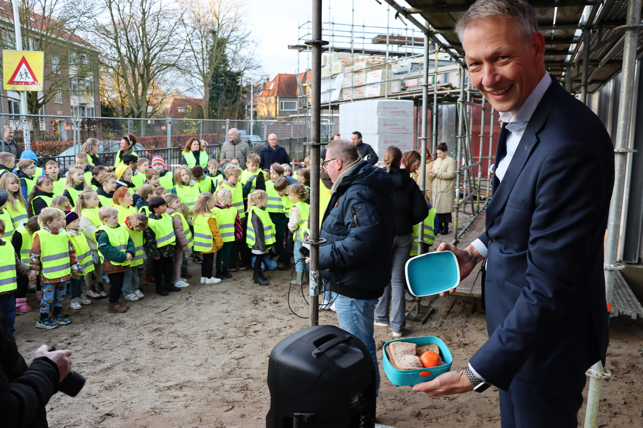 Het was een mooi gezicht op de vroege, zonnige decemberochtend. De wethouder en directeur Gerdo van den Burg van Het Atelier spraken de kinderen toe, die allemaal in een geel veiligheidshesje gehuld waren. Die hadden ze van aannemer Dons en Troost gekregen. Vervolgens metselde de wethouder de eerste steen, nadat hij zijn gemeentespeld in de metselspecie had gestoken. Daarna zetten alle kinderen hun naam of een tekening op de muur.