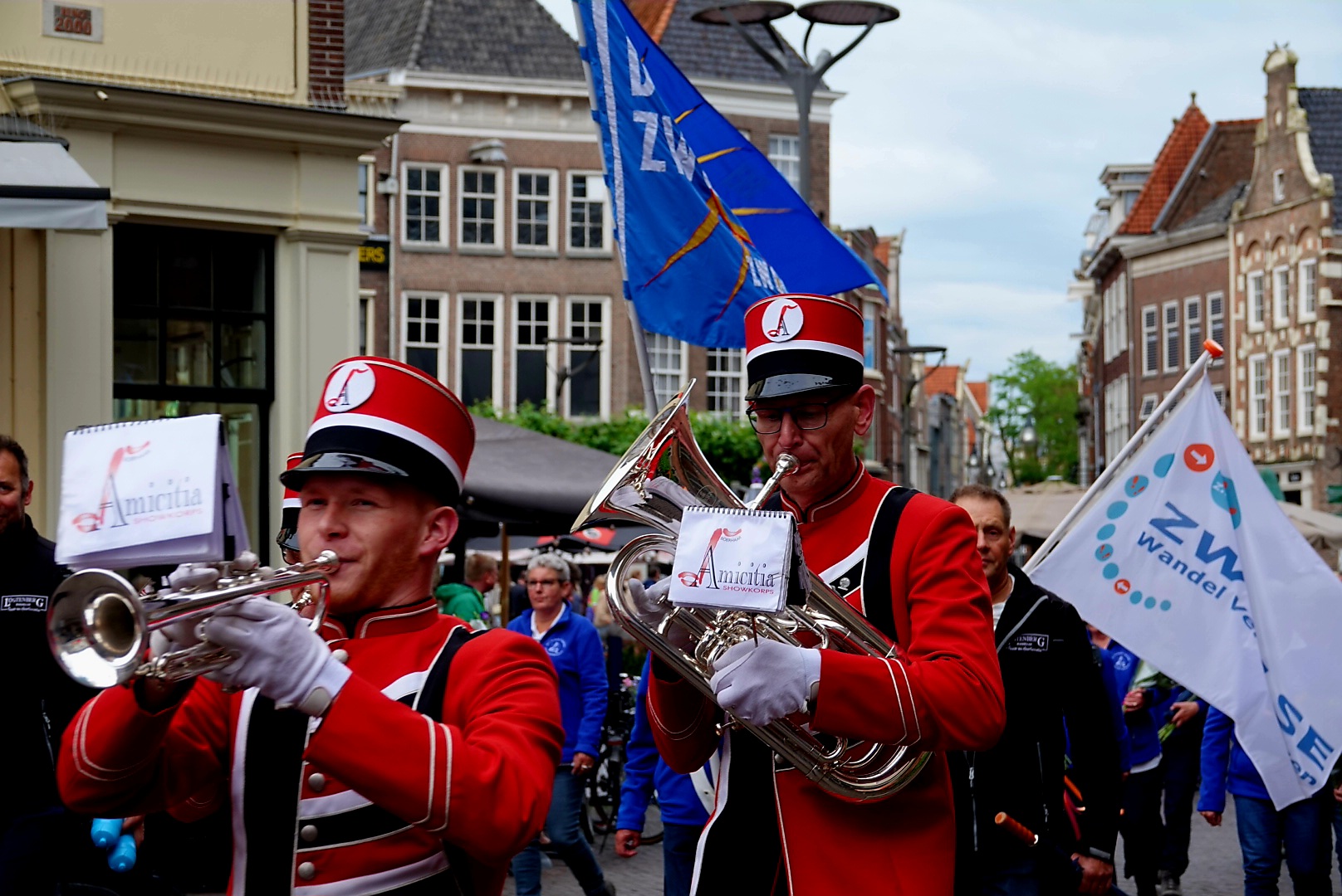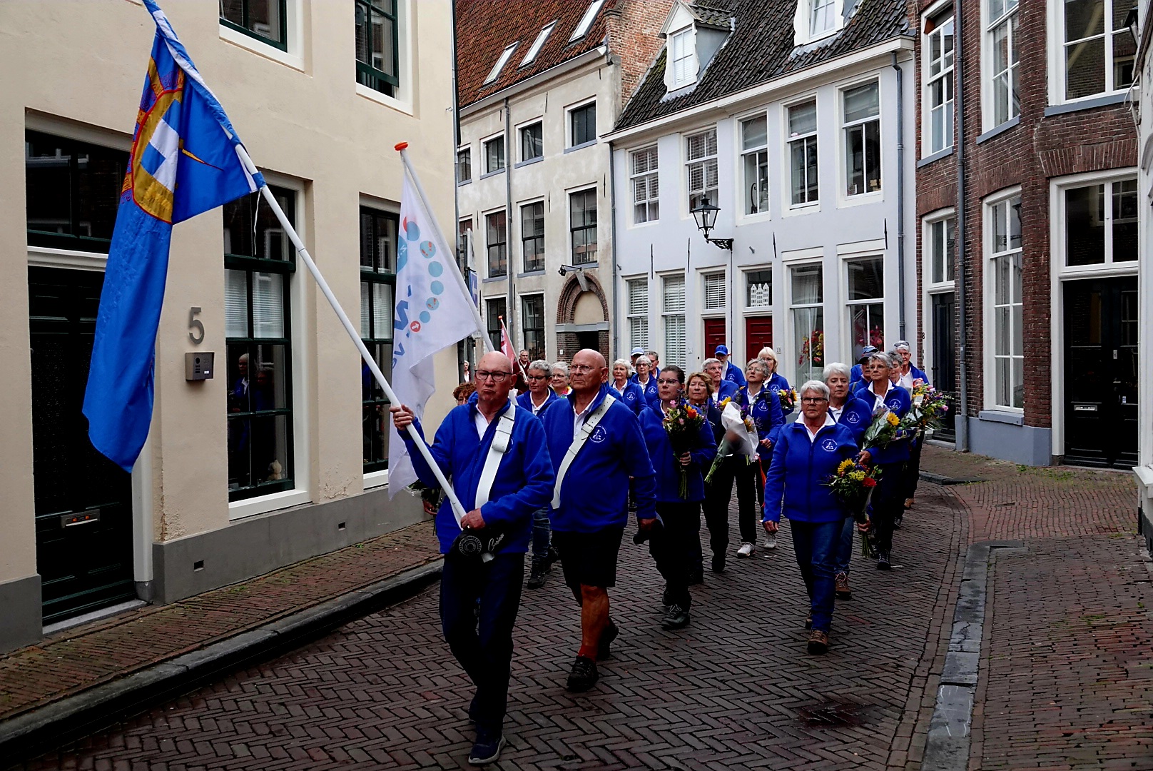 Bij het stadhuis stond wethouder Michiel van Willigen (Sport) als trotse vertegenwoordiger van de gemeente klaar om, mét ambtsketen, het defilé af te nemen. Samen met organisatoren van de wandelverenigingen zwaaide hij de wandelaars feestelijk binnen. En de wandelverenigingen zelf? Die liepen natuurlijk ook mee – herkenbaar aan de trotse vaandeldragers voorop.