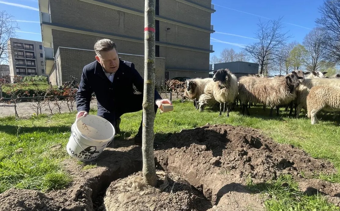 De wolpellets zijn gemaakt van wol van de Zwolse schaapskudde. Hiermee zorgen de gemeente, ROVA en de schaapskudde voor een mooie lokale circulaire toepassing van het product. Woensdag 19 april strooide wethouder Arjan Spaans, onder toeziend oog van een aantal schapen uit de schaapskudde, wolpellets bij een nieuwe boom aan de Sibeliusstraat in de wijk Holtenbroek.
